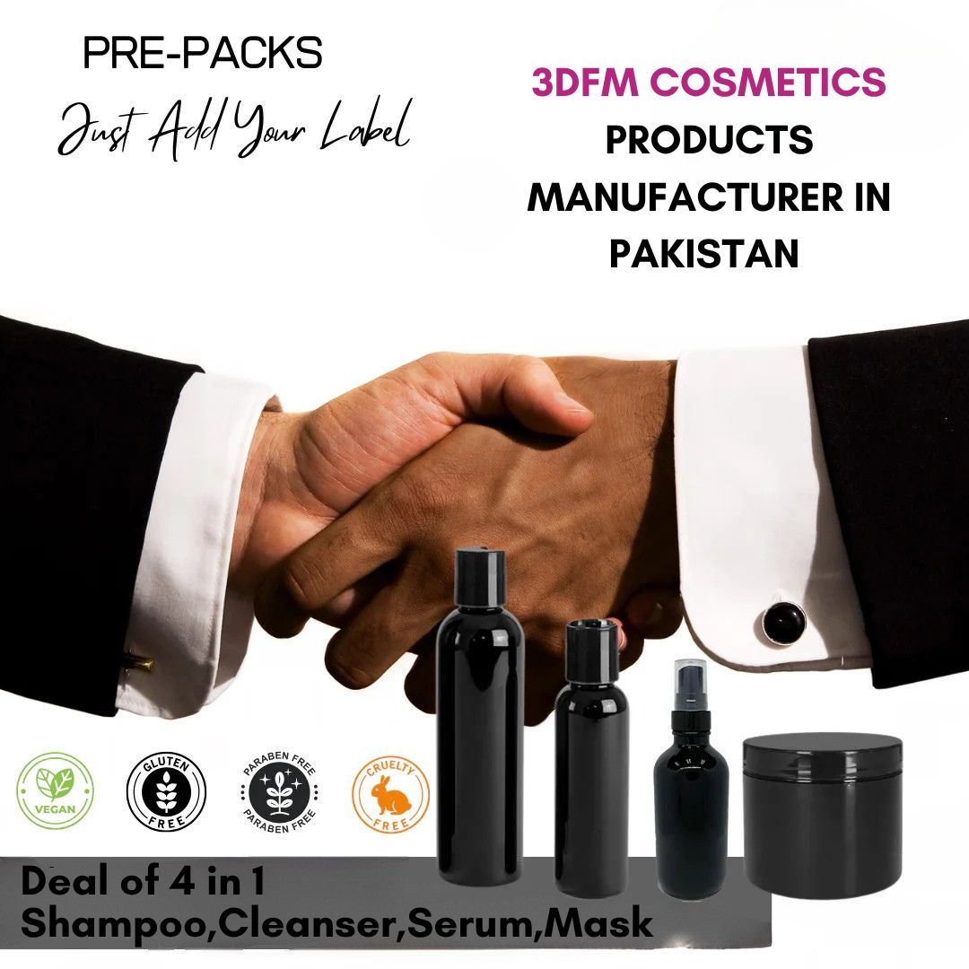 3DFM Cosmetics presents a ready-to-brand 4-in-1 product deal including Shampoo, Cleanser, Serum, and Mask – all professionally formulated and pre-packed in high-quality containers. Just add your own label and start selling immediately!
